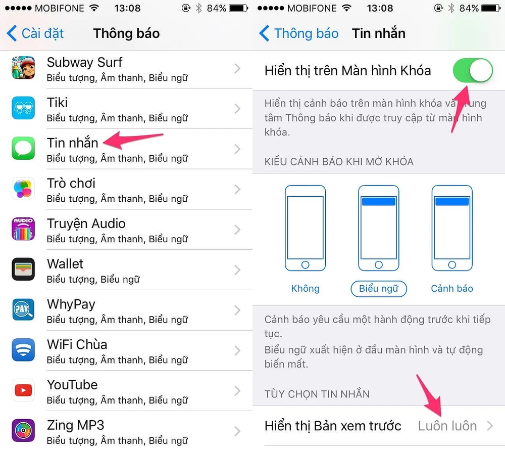 Để khắc phục, bạn hãy truy cập vào phần Settings (cài đặt) > Notifications (thông báo) > Messages (tin nhắn), sau đó vô hiệu hóa cả hai tùy chọn Show on Lock Screen (hiển thị trên màn hình khóa) và Show Previews (hiển thị bản xem trước). Thực hiện tương tự đối với Facebook Messenger hoặc các ứng dụng tin nhắn khác.