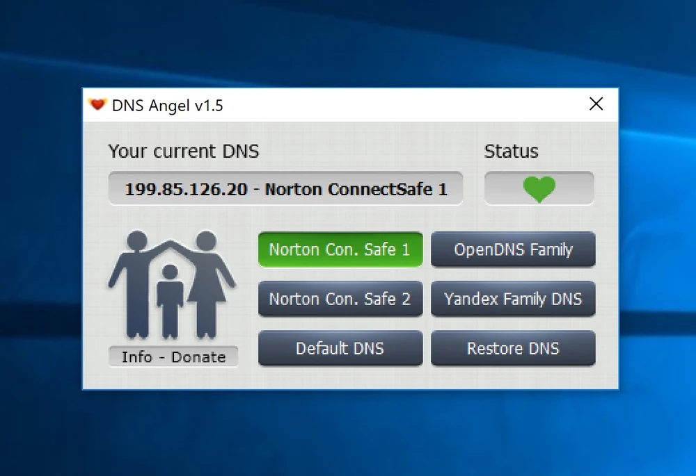 - Bước 2: Khi hoàn tất, bạn chỉ cần nhấp đúp vào tập tin thực thi để sử dụng ngay mà không cần cài đặt. Người dùng có thể chuyển sang các máy chủ DNS có độ bảo mật cao như Norton Con. Safe 1, Norton Con. Safe 2, OpenDNS Family và Yandex Family DNS.