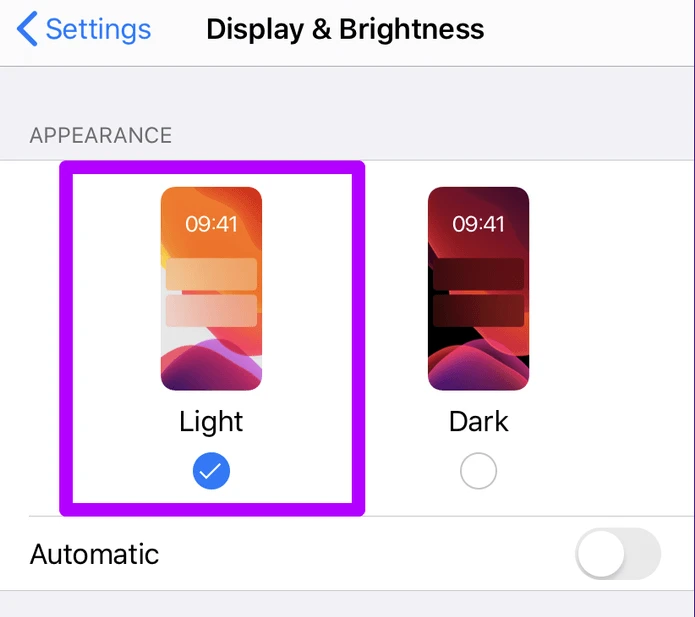 Ngoài ra, bạn cũng có thể bật/tắt nhanh chế độ tối bằng cách truy cập vào Settings (cài đặt) > Display & Brightness (màn hình và độ sáng), sau đó lựa chọn Light (sáng) hoặc Dark (tối) tùy vào nhu cầu sử dụng.