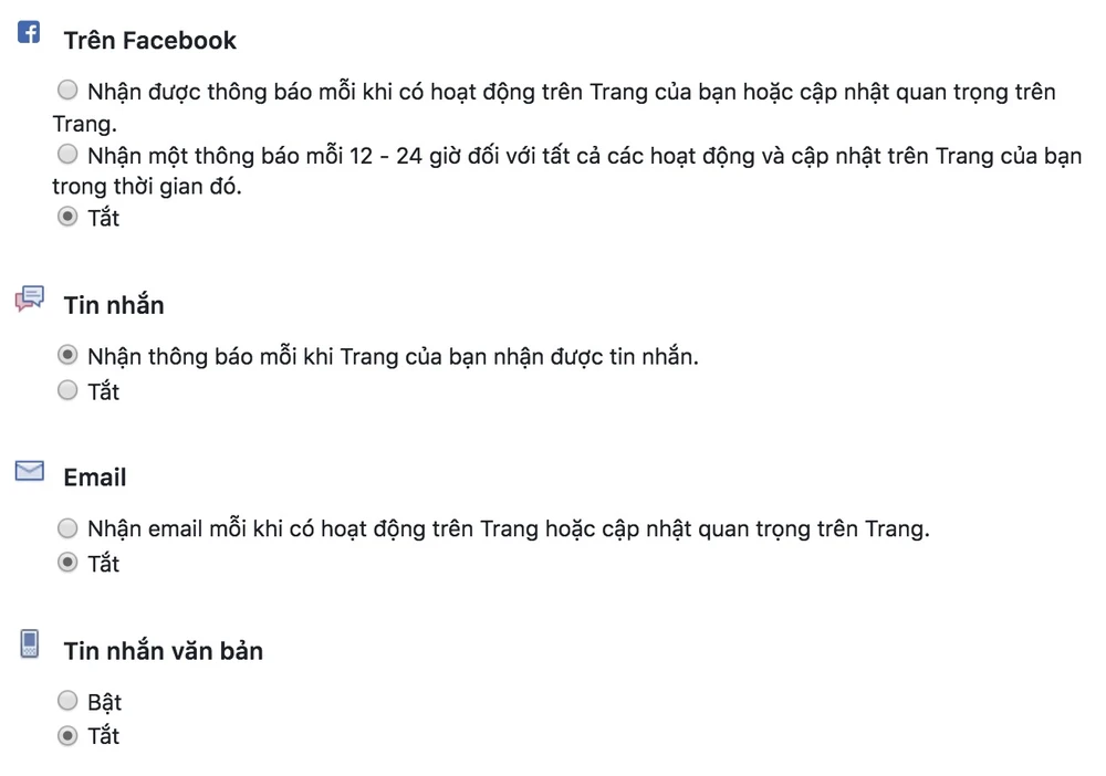 Tại mục Thông báo (Notifications), bạn đánh dấu vào ô Nhận được thông báo mỗi khi có hoạt động trên trang hoặc cập nhật quan trọng trên trang (Get a notification each time there is activity on your page or an important page update). Kéo xuống dưới, dòng Bình luận mới về bài viết trên trang (New Comments on Page post), chuyển sang chế độ Bật để nhận thông báo khi có bình luận trên trang.