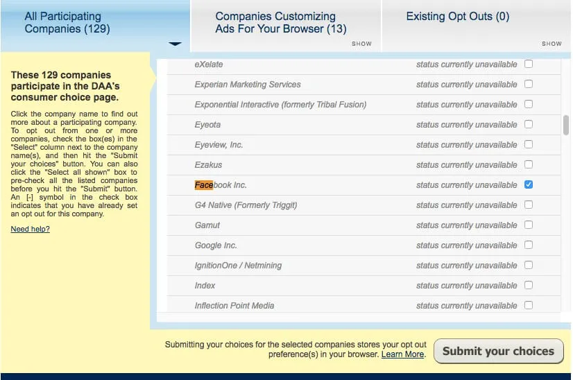 Ngoài ra, người dùng cũng có thể sử dụng Digital Advertising Alliance để ngăn không cho Facebook theo dõi và hiển thị quảng cáo thông qua lịch sử lướt web. Việc bạn cần làm là truy cập vào http://www.aboutads.info/choices/, kéo xuống bên dưới và đánh dấu chọn vào ô Facebook Inc, sau đó nhấn Submit your choice.