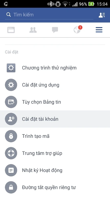 Bước 1: Bạn mở ứng dụng Facebook lên, sau đó vào thiết lập tài khoản (trên menu ứng dụng)