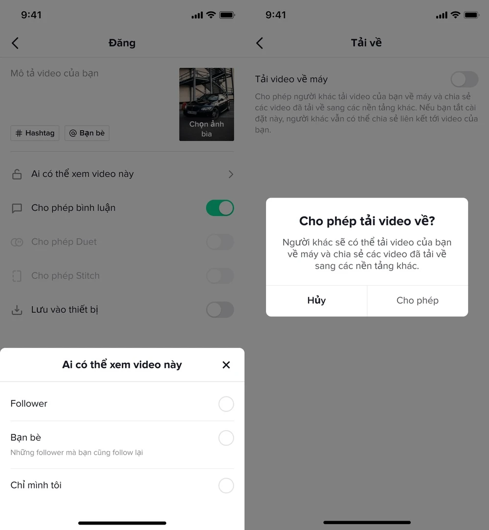 Khi kích hoạt tính năng "Tải về", bạn sẽ nhận được thông báo yêu cầu xác nhận trước khi người khác có thể tải về video của bạn. Lưu ý rằng tính năng này cũng sẽ bị vô hiệu hóa đối với các tài khoản dưới 16 tuổi.