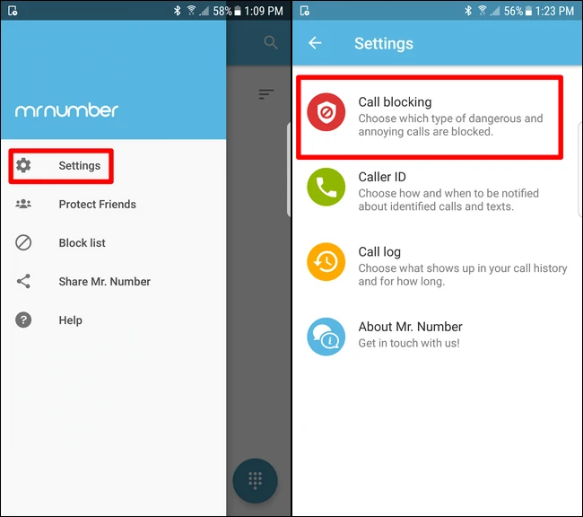 - Bước 2: Khi hoàn tất, bạn hãy mở ứng dụng, bấm vào biểu tượng menu ở góc trên bên trái và chọn Settings > Call blocking. Tại đây, người dùng có thể kích hoạt tính năng tự động chặn các số điện thoại gian lận, mã vùng, số quốc tế hoặc số không có trong danh bạ.