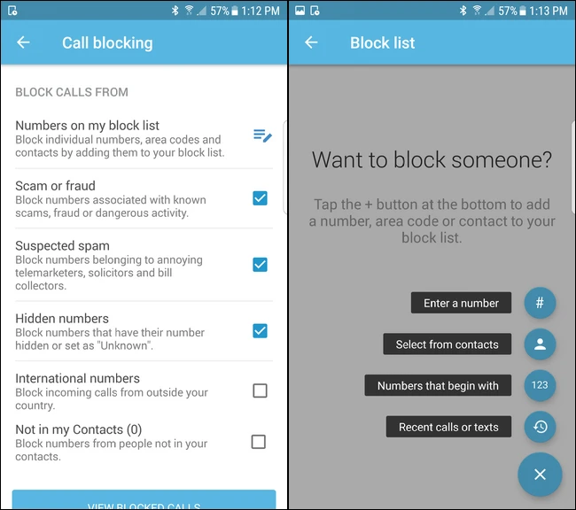 - Bước 3: Tại giao diện chính, người dùng có thể chặn những cuộc gọi mời chào bảo hiểm bằng cách nhập vào số điện thoại của họ thông qua tùy chọn Enter a number, chọn từ danh bạ (Select from contacts), số điện thoại bắt đầu với (Numbers that begin with) và những cuộc gọi gần đây (Recents call or texts).