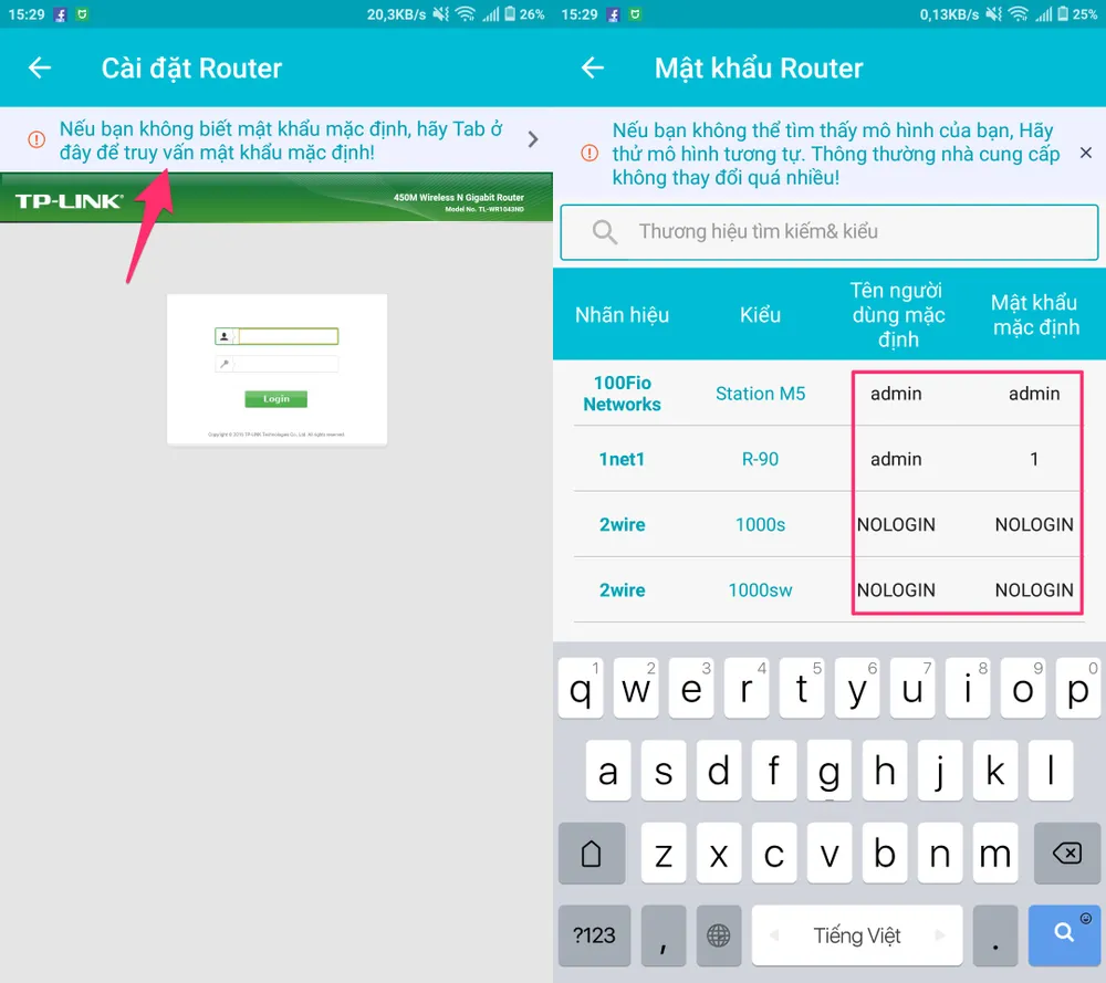 - Bước 3: Lúc này, bạn sẽ được chuyển đến trang đăng nhập router. Nếu không nhớ tên đăng nhập và mật khẩu, bạn có thể bấm vào gợi ý ở phía trên. WiFi Router Master cung cấp sẵn một cơ sở dữ liệu gồm tên đăng nhập và mật khẩu mặc định của nhiều dòng router khác nhau gồm Netgear, TP-Link, Linksys... Để tiết kiệm thời gian, người dùng có thể nhập model router vào khung tìm kiếm.