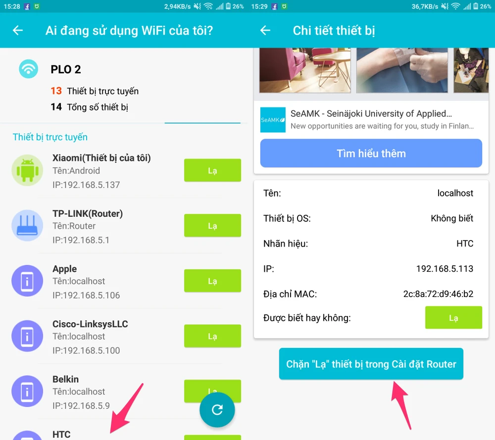 - Bước 2: Để kiểm tra danh sách các thiết bị đang kết nối WiFi, bạn hãy bấm vào mục Ai đang sử dụng WiFi của tôi? và chờ một lát cho đến khi quá trình kiểm tra kết thúc. Nếu thấy xuất hiện các thiết bị lạ, người dùng chỉ cần bấm vào tên thiết bị và chọn Chặn "Lạ" thiết bị trong Cài đặt Router.