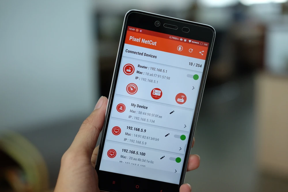 Nếu là lần đầu tiên sử dụng, bạn hãy nhấn vào nút Grant để cấp quyền superuser cho ứng dụng. Tiếp theo, để kiểm tra các thiết bị đang kết nối Wi-Fi, người dùng chỉ cần nhấn vào biểu tượng nút tròn màu đỏ ngay trên màn hình và chờ một lát để quá trình này hoàn tất. Kết quả trả về sẽ bao gồm địa chỉ IP và địa chỉ MAC của tất cả thiết bị đang kết nối (router, máy tính, smartphone, camera IP…).