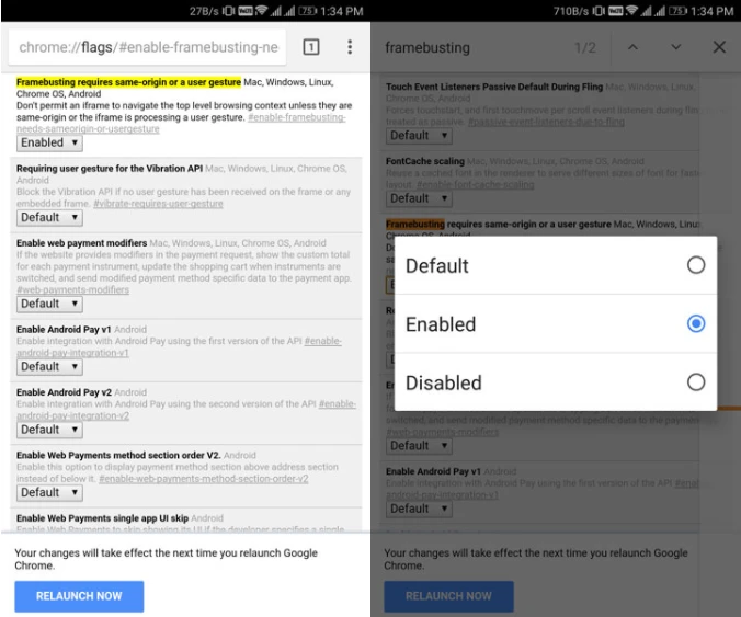 - Bước 3: Nhập vào từ khóa framebusting và chuyển tùy chọn Default thành Enable. Tiếp theo, bạn chỉ cần nhấn Relaunch Now để khởi động lại trình duyệt Google Chrome và áp dụng các thay đổi.