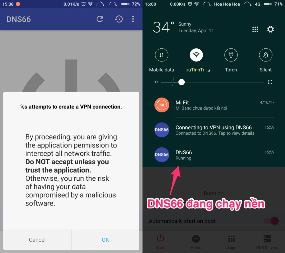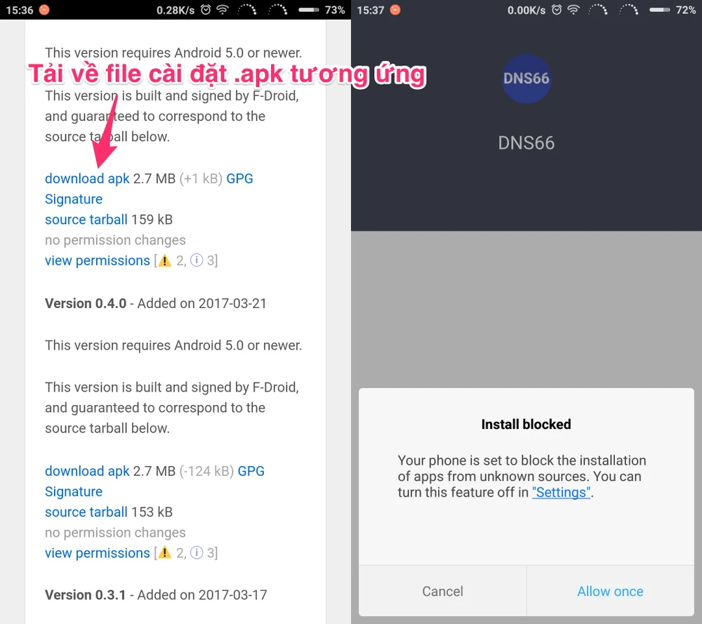- Bước 1: Đầu tiên, bạn hãy tải tập tin cài đặt DNS66 dưới dạng file .apk tại địa chỉ http://bit.ly/2Jiajuw, tương thích với các thiết bị chạy Android 5.0 hoặc cao hơn (không yêu cầu root), hãy chắc chắn rằng tùy chọn Unknown sources (không rõ nguồn gốc) đã được kích hoạt trong phần Settings (cài đặt) > Security (bảo mật).