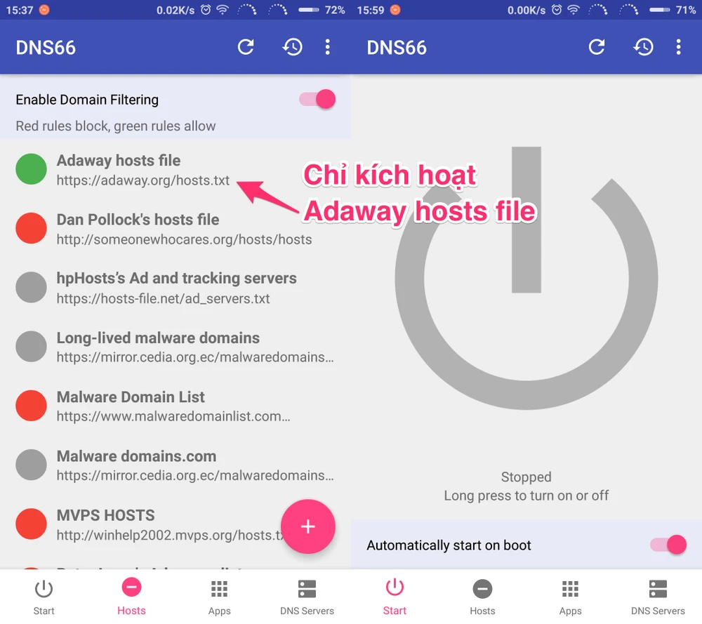 - Bước 3: Tại đây có rất nhiều bộ lọc để lựa chọn, tuy nhiên, người dùng chỉ cần bấm vào biểu tượng chấm tròn màu đỏ ở mục Adaway hosts file cho đến khi nó chuyển sang màu xanh lá.