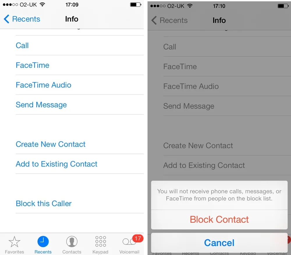 Nếu đang sử dụng iOS 8 hoặc cao hơn, người dùng chỉ cần mở ứng dụng quay số và chọn vào thẻ Recent (gần đây). Để chặn một số bất kỳ, bạn hãy chạm vào biểu tượng chữ “i” ở số điện thoại hoặc tên người, di chuyển xuống cuối và chọn Block this contact. Khi đó số điện thoại này sẽ không thể nào liên lạc được với bạn, kể cả việc nhắn tin, Facetime…