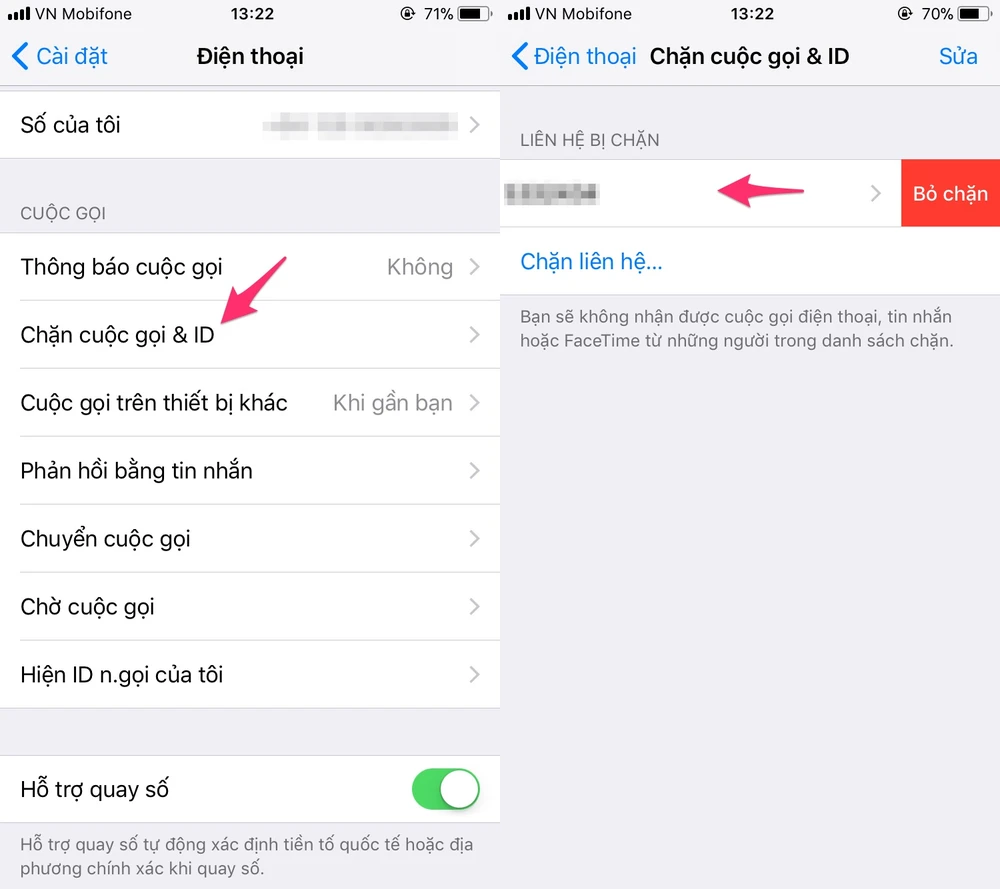 Ngược lại, nếu muốn bỏ chặn, người dùng chỉ cần vào Settings (cài đặt) > Phone (điện thoại) > Call Blocking & Identification (chặn cuộc gọi & ID), sau đó vuốt từ phải sang trái và chọn Unblock (bỏ chặn).