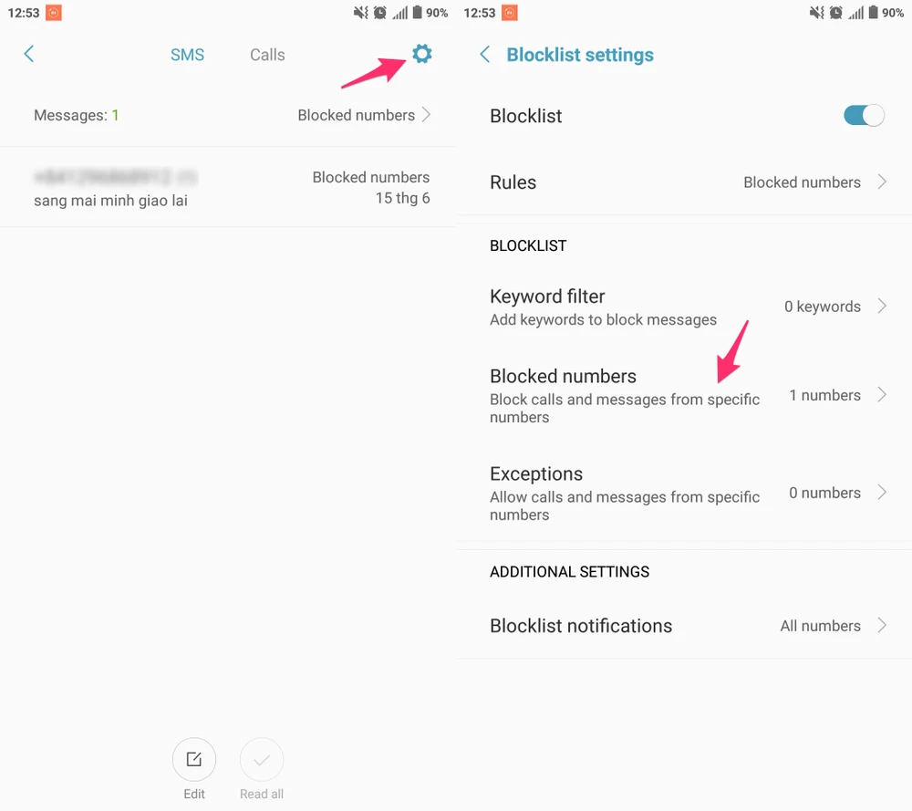 Nếu muốn bỏ chặn, bạn bấm vào biểu tượng bánh xe răng cưa ở góc phải, chọn Blocked numbers (số bị chặn) > Unblock (bỏ chặn). Lưu ý, tên và vị trí các tùy chọn có thể thay đổi tùy vào thiết bị bạn đang sử dụng.