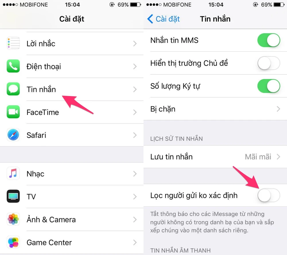 Đầu tiên, bạn truy cập vào phần Settings (cài đặt) > Messages (tin nhắn) và kích hoạt tùy chọn Filter Unknown Senders (lọc người gửi không xác định). Kể từ lúc này, iMessage sẽ không hiển thị thông báo và chuyển tin nhắn của những người gửi không nằm trong danh bạ vào một thư mục riêng biệt.