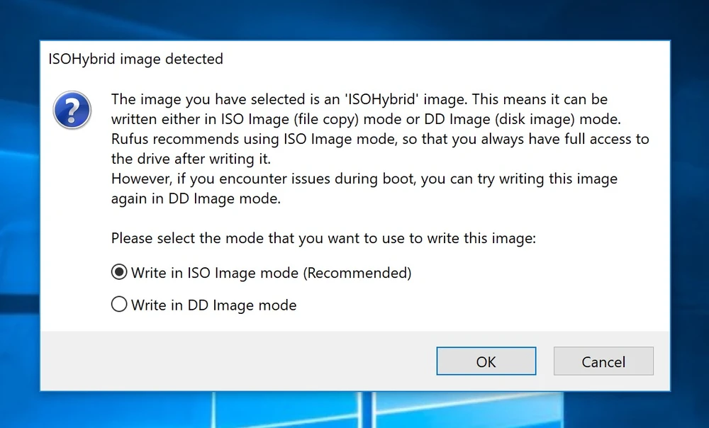 Nhấn Start để bắt đầu và chờ một lát cho đến khi quá trình tạo bộ cài hoàn tất. Nếu thông báo ISOHybrid image detected xuất hiện, bạn hãy chọn Recommended > OK. Cuối cùng, tắt Rufus và ngắt kết nối USB hoặc thẻ nhớ khỏi máy tính.