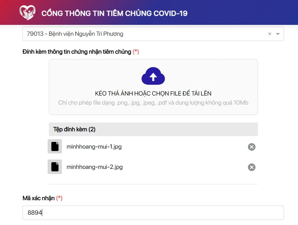 Đính kèm giấy chứng nhận tiêm chủng trước đó, bạn có thể chụp lại bằng điện thoại và tải lên. Ảnh: MINH HOÀNG