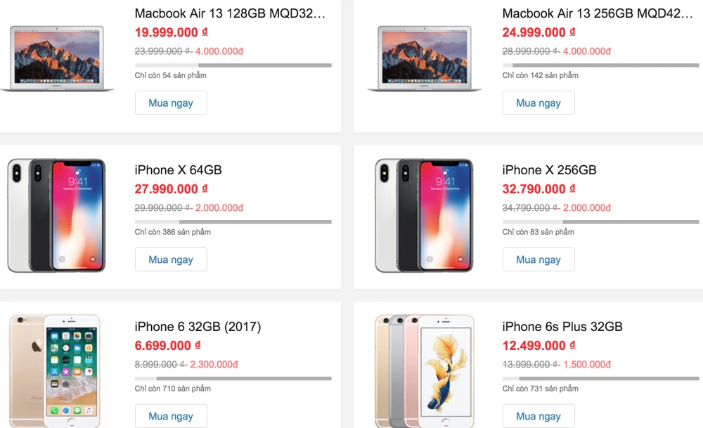 Ngoài MacBook, các sản phẩm khác của Apple như iPhone, iPad cũng được giảm giá 2 triệu đồng trong đợt này. Cụ thể, phiên bản iPhone X 64 GB hiện được bán ra với mức giá 27,99 triệu (giảm 2 triệu đồng so với trước đó). Tương tự, phiên bản iPhone X có dung lượng lưu trữ 256 GB cũng giảm còn 32,79 triệu đồng. Đặc biệt, khi thanh toán online bằng thẻ Mastercard, người dùng còn được giảm thêm 1,5 triệu đồng.