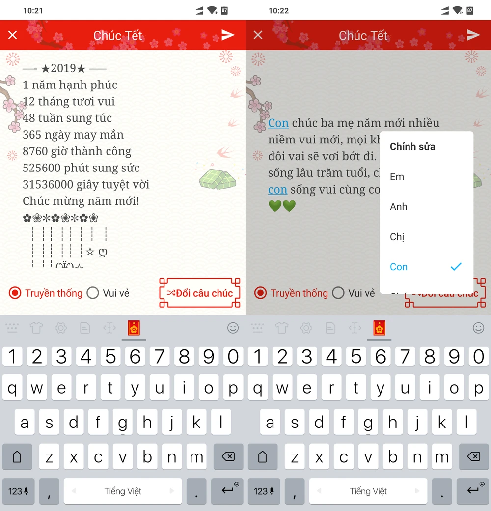 Kể từ lúc này, mỗi khi mở ứng dụng tin nhắn hoặc bất kì cửa sổ nhập liệu nào, bạn chỉ cần bấm vào biểu tượng bao lì xì màu đỏ trên thanh gợi ý và chọn câu chúc tết. Tại đây sẽ có hai kiểu chúc bao gồm truyền thống và độc đáo, tất nhiên bạn hoàn toàn có thể đổi lại danh xưng (anh/chị/em/con/mày/tao,…) cho phù hợp với người nhận.