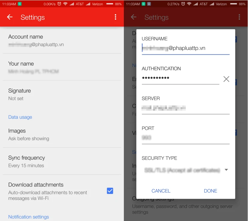 Sau đó, người dùng cần phải cấu hình toàn bộ thông tin như tên đăng nhập, mật khẩu, mail server, loại bảo mật, port (có những mục chỉ xuất hiện khi bạn sử dụng mail cơ quan, doanh nghiệp), thời gian đồng bộ…