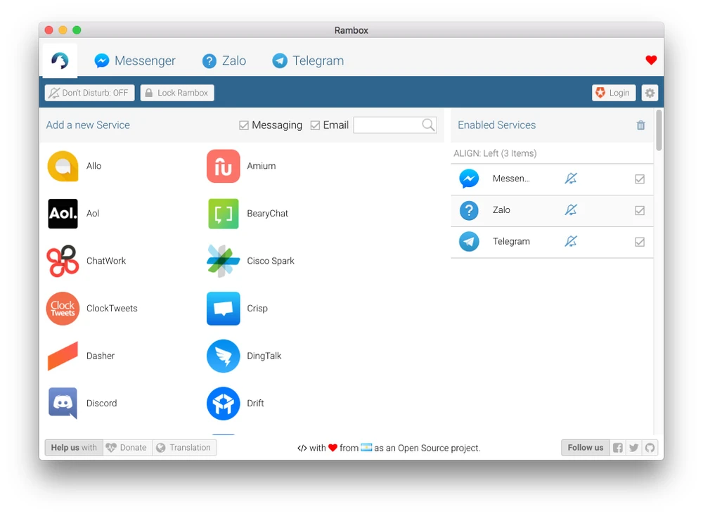Nếu cảm thấy All-in-One Messenger quá ít dịch vụ, bạn hãy thử phần mềm Rambox tại địa chỉ http://bit.ly/rambox-1, tương thích Windows, macOS và Linux. Đối với phiên bản miễn phí, bạn chỉ có thể quản lý được khoảng 99 ứng dụng và dịch vụ OTT khác nhau, tuy nhiên, nhiêu đó là đã quá đủ đối với một người dùng thông thường.