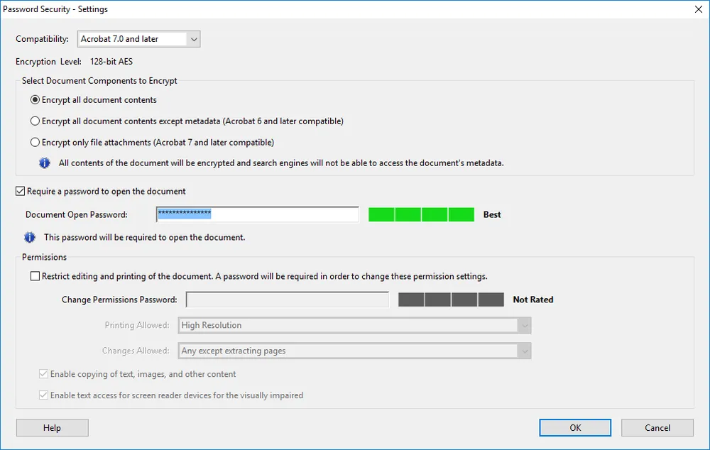 5. Đánh dấu chọn vào mục Require a password to open document, sau đó nhập mật khẩu. Adobe Acrobat đồng thời hiển thị cho bạn biết độ mạnh mật khẩu thông qua thanh mức độ bên phải của khung nhập mật khẩu. Ngoài ra, bạn có thể vô hiệu hóa khả năng chỉnh sửa và in ấn tài liệu bằng cách chọn mục Restrict editing and printing of the document… và nhập mật khẩu vào ô Change Permission Password.