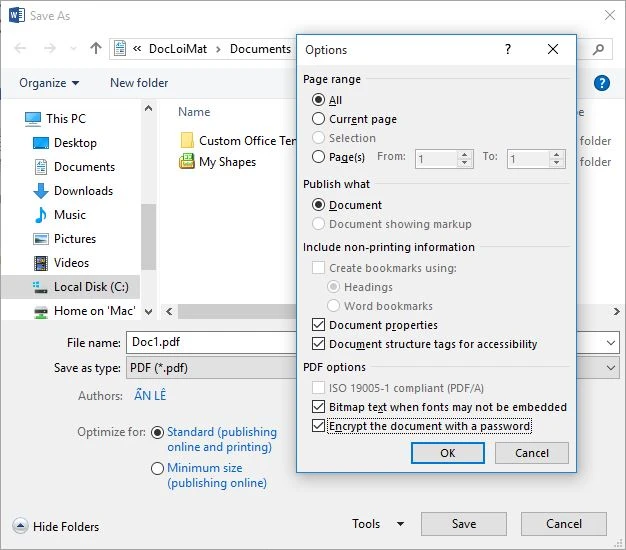 Nếu tài liệu của bạn được tạo ra từ bộ công cụ Microsoft Office (chẳng hạn Word, Excel, PowerPoint), bạn có thể dễ dàng mã hóa nó bằng cách lưu nó dưới dạng file PDF đồng thời đặt mật khẩu bảo vệ bằng cách: