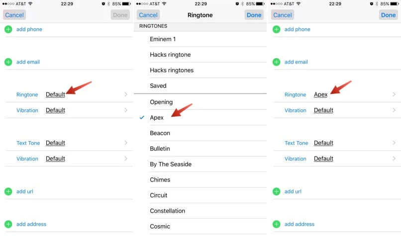 - Bước 3: Lúc này, Apple sẽ hiển thị một danh sách nhạc chuông mặc định để người dùng lựa chọn, chẳng hạn như Apex, Beacon, Chimes… Khi hoàn tất, bạn chỉ cần nhấn Done để lưu lại. Tương tự như vậy cho các số điện thoại còn lại.