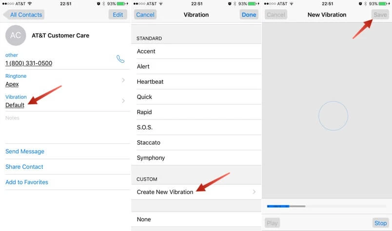Nếu muốn thay đổi nhạc chuông tin nhắn, bạn hãy chạm vào tùy chọn Default ở mục Text Tone rồi thực hiện tương tự như trên. Ngoài ra, người dùng còn có thể tạo kiểu rung cho từng số điện thoại thông qua phần Vibration > Create New Vibration rồi nhấn Save để lưu lại.