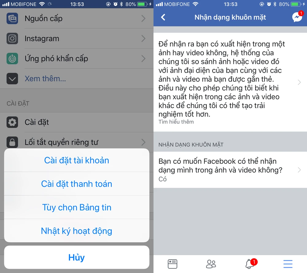 Nếu đang sử dụng smartphone, bạn chỉ cần mở ứng dụng Facebook, bấm vào biểu tượng menu ở góc phải bên dưới và chọn Settings (cài đặt) > Account settings (cài đặt tài khoản) > Face Recognition (nhận diện khuôn mặt) > Yes (có).