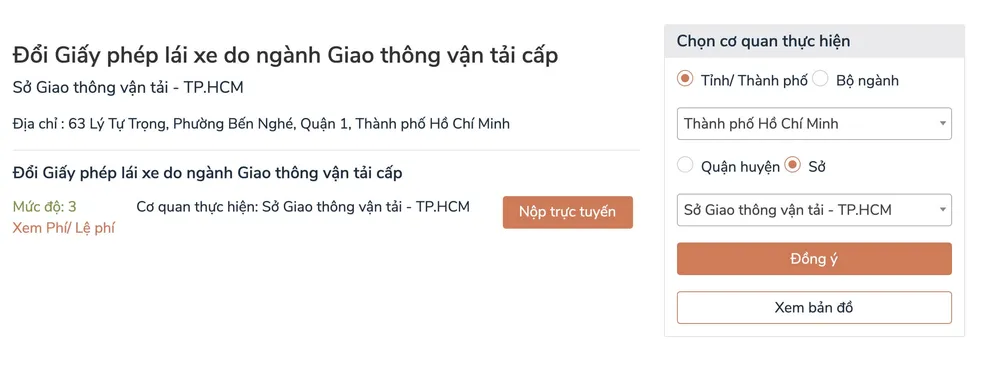 Tiếp theo, bạn hãy chọn cơ quan thực hiện là Sở GTVT của tỉnh/thành phố hoặc chọn trực tiếp bộ, ngành. Theo ghi nhận, hiện vẫn còn khá nhiều tỉnh/thành phố đang trong quá trình thực hiện chuẩn hóa dịch vụ công để tích hợp với Cổng dịch vụ công Quốc gia. Do đó, người dùng chỉ có thể chọn cấp lại GPLX tại một số thành phố lớn như TP.HCM, Hà Nội… hoặc Bộ GTVT rồi nhấn đồng ý.