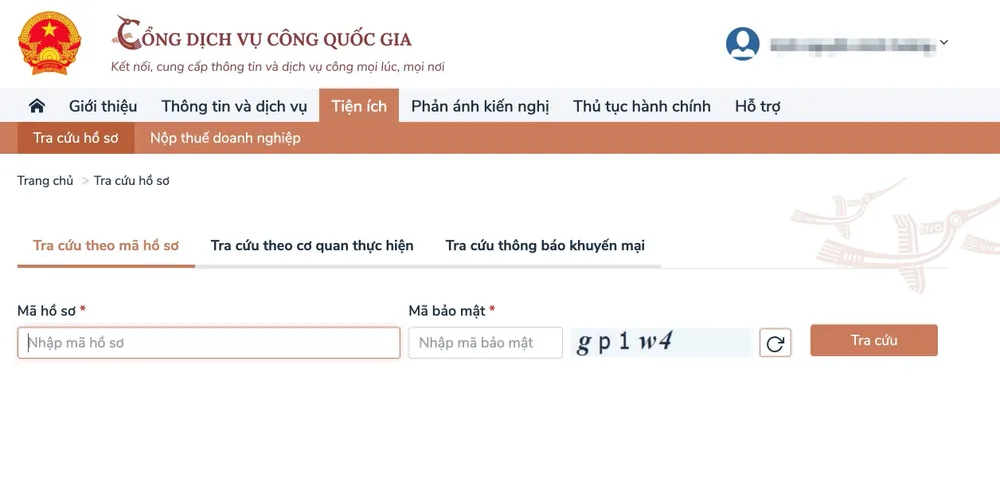 Trong trường hợp muốn tra cứu tiến độ xử lý hồ sơ, bạn hãy truy cập vào địa chỉ https://dichvucong.gov.vn/, chọn vào mục Tiện ích - Tra cứu hồ sơ. Sau đó, nhập mã hồ sơ vào khung trống rồi nhấn Tra cứu.