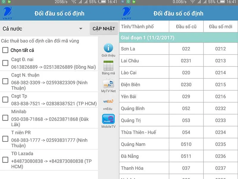 Để tiết kiệm thời gian, bạn có thể cài đặt ứng dụng VNPT Update Contacts tại địa chỉ https://goo.gl/SmeYmD. Phần mềm cho phép người dùng đổi mã vùng theo ba giai đoạn hoặc theo từng khu vực, việc bạn cần làm là đánh dấu chọn vào các số cần đổi, sau đó nhấn Cập nhật và chờ hoàn tất.