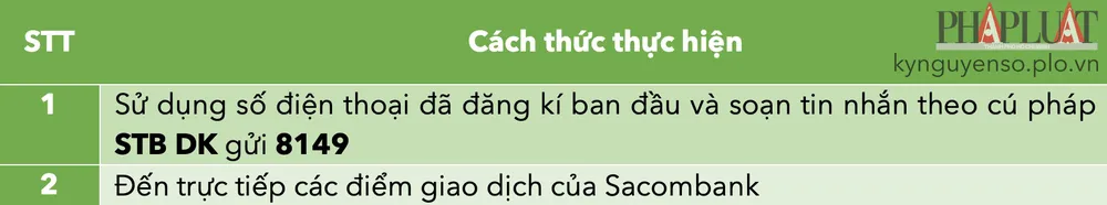 Từ ngày 15-9-2018 đến hết ngày 3-11-2018, bạn dùng số điện thoại đã đăng ký ban đầu với Sacombank (số cũ hoặc số đã chuyển đổi) và soạn tin nhắn STB DK gửi 8149 hoặc người dùng có thể đến trực tiếp các điểm giao dịch của Sacombank.