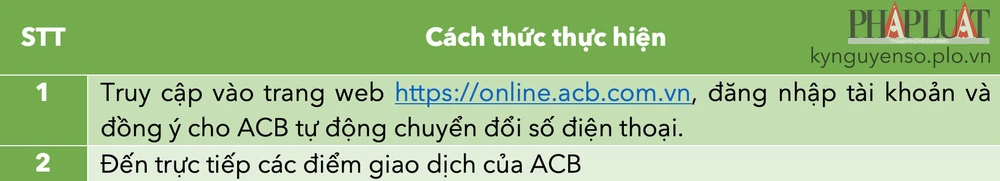 Người dùng có thể xác nhận đồng ý cho ACB được tự động chuyển đổi thông tin mã mạng bằng cách đăng nhập vào trang web https://online.acb.com.vn hoặc chủ động đến các phòng giao dịch của ACB.