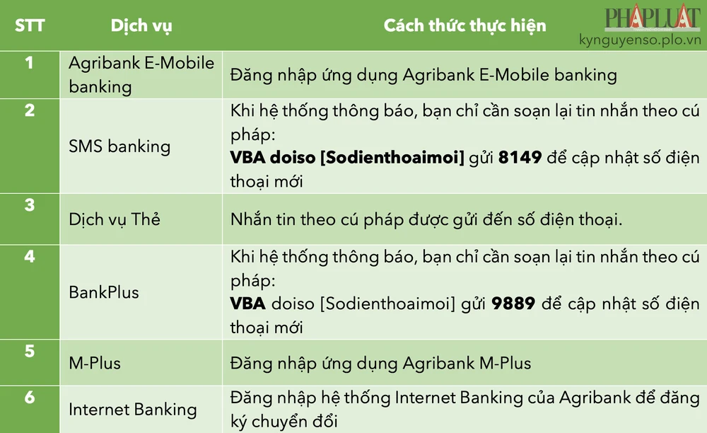 - Tổ chức: Agribank sẽ thông báo và hướng dẫn cụ thể để khách hàng thực hiện chuyển đổi số điện thoại đăng ký dịch vụ trực tiếp tại 2.300 chi nhánh, điểm giao dịch của Agribank.