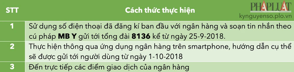 - Bạn chỉ cần sử dụng số điện thoại đã đăng ký ban đầu với ngân hàng và soạn tin nhắn theo cú pháp MB Y gửi tới tổng đài 8136 kể từ ngày 25-9-2018.