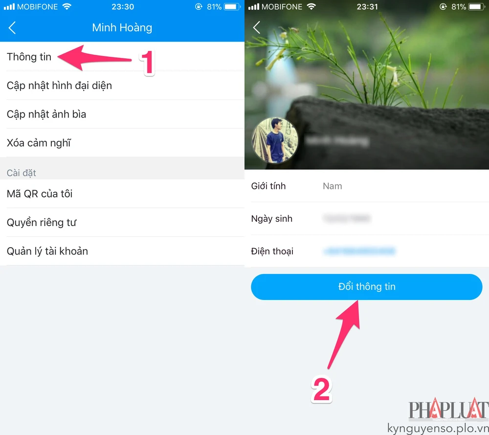 - Bước 3: Tiếp theo, bạn chạm vào biểu tượng “…” ở góc phải và chọn Thông tin > Đổi thông tin. Tại đây, người dùng có thể thay đổi tên tài khoản, giới tính, ngày sinh hoặc hình ảnh. Nếu muốn nhanh hơn, bạn có thể sử dụng thông tin từ Facebook, cuối cùng nhấn Cập nhật để lưu lại.