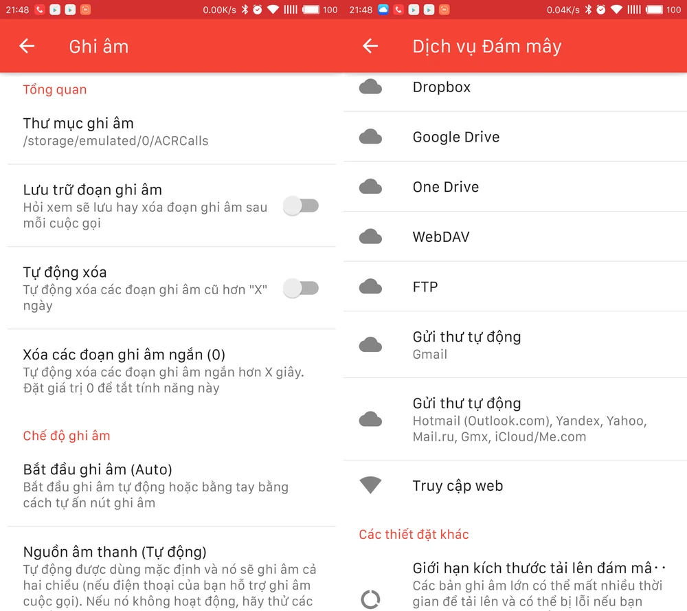 Bên cạnh đó, bạn cũng có thể lựa chọn nơi lưu trữ, tự động xóa tập tin ghi âm sau x ngày, lọc âm thanh, đồng bộ hóa dữ liệu lên các dịch vụ đám mây như Dropbox, Google Drive, One Drive…