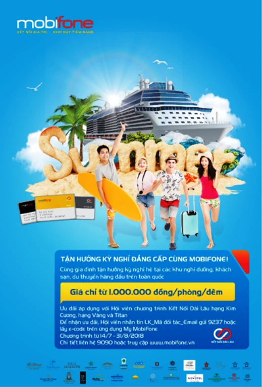 Hè 2018 này, MobiFone triển khai chương trình ưu đãi nghỉ dưỡng hè đặc biệt cho các hội viên “Kết nối dài lâu”. Theo đó, hội viên hạng kim cương, vàng, titan sẽ có cơ hội đặt phòng nghỉ dưỡng hạng sang với giá chỉ từ 1 triệu đồng/phòng/đêm khi nghỉ dưỡng tại các khách sạn, resort, du thuyền cao cấp. Hội viên hạng kim cương được hưởng ưu đãi tối đa lên đến bốn đêm nghỉ. Chương trình ưu đãi này được áp dụng từ nay đến hết ngày 31-8-2018.