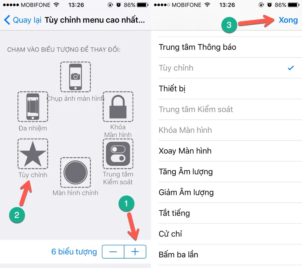 Nếu muốn thay đổi chức năng, bạn chỉ cần chạm vào một tùy chọn bất kì, sau đó lựa chọn tính năng tương ứng, nhấn Done (xong) để lưu lại.
