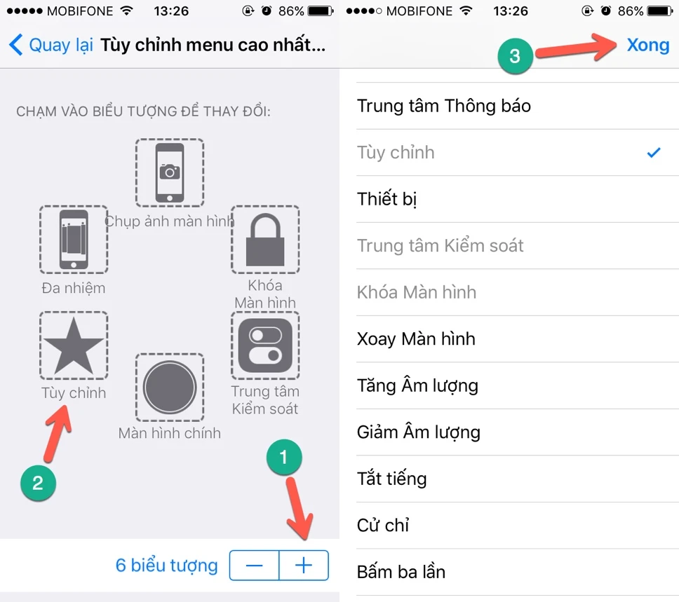 Để phù hợp với nhu cầu sử dụng, bạn có thể chỉnh sửa lại các tùy chọn này bằng cách nhấn vào mục Customize Top Level Menu (tùy chỉnh menu cao nhất). Mặc định, AssistiveTouch sẽ chỉ có 6 nút chức năng, cho phép truy cập nhanh vào Notification Center (trung tâm thông báo), Siri, Custom (tùy chỉnh)… Người dùng có thể nhấp vào biểu tượng dấu “+” hoặc “-“ để thêm mới hoặc loại bỏ các tùy chọn ít sử dụng.