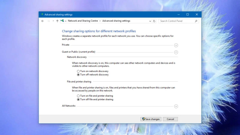 Đầu tiên, bạn bấm phải chuột vào biểu tượng mạng ở góc phải bên dưới, chọn Network and Sharing Center > Change advanced sharing settings > Turn off network discovery và Turn off file and printer sharing.
