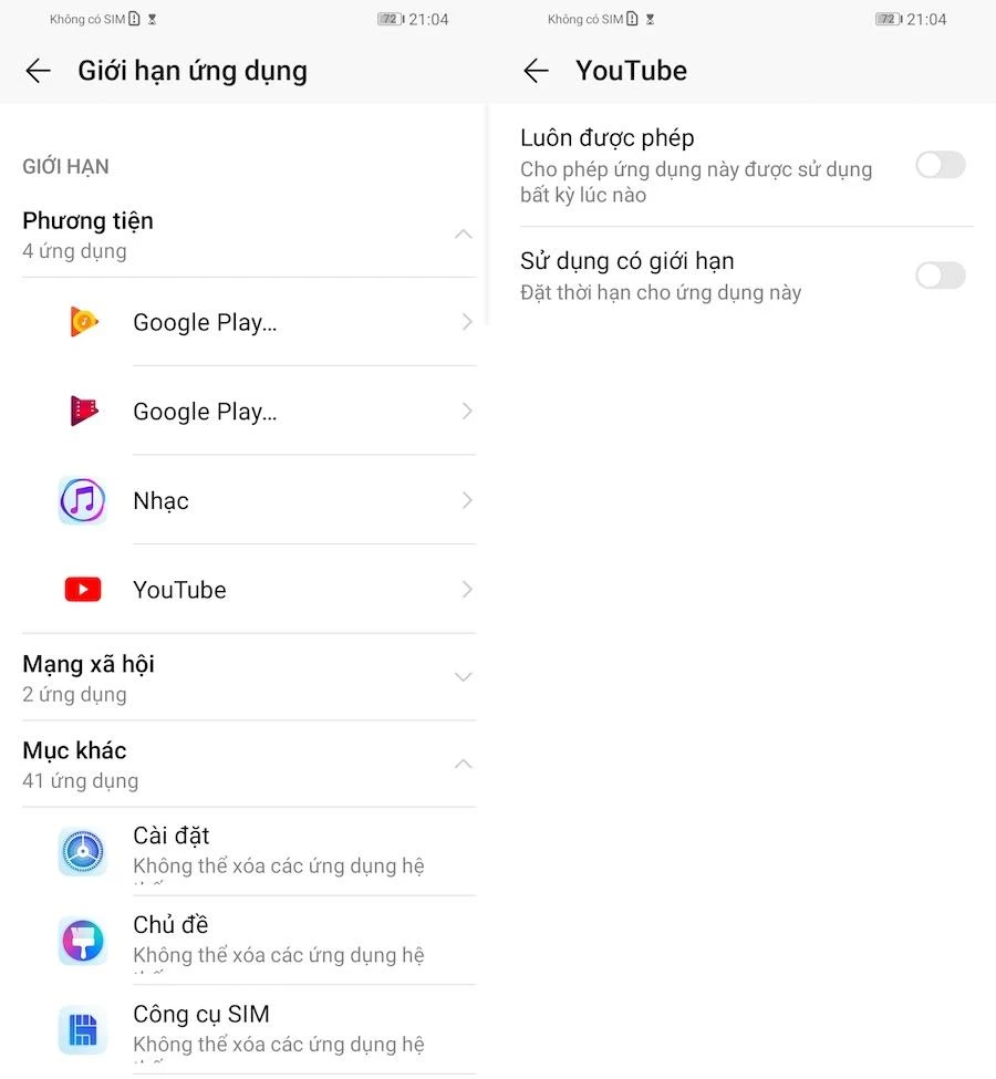 Tương tự, nếu muốn cấm trẻ chơi game, lướt Facebook hoặc xem YouTube, bạn hãy nhấp vào tùy chọn App limits (giới hạn ứng dụng). Đầu tiên, bạn hãy chọn một ứng dụng bất kì, sau đó kích hoạt tùy chọn Limit use (sử dụng có giới hạn) để cấm trẻ sử dụng ứng dụng (đặt thời gian là 0 phút), ngược lại, nếu cho phép trẻ sử dụng thì hãy chọn Always allowed (luôn được phép).