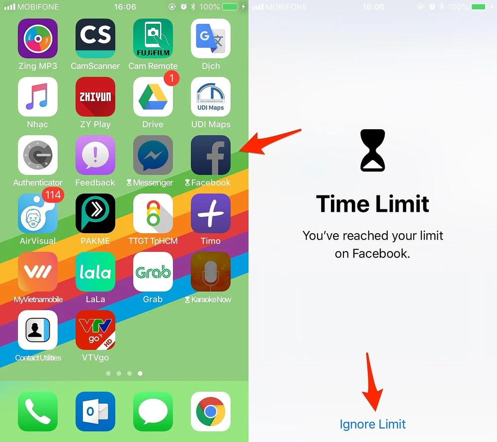 Khi hết thời gian, màn hình sẽ hiển thị thông báo nhắc nhở, tất nhiên người dùng vẫn có thể bỏ qua giới hạn bằng cách nhấp vào tùy chọn Ignore Limit để sử dụng tiếp trong 15 phút hoặc cả ngày.