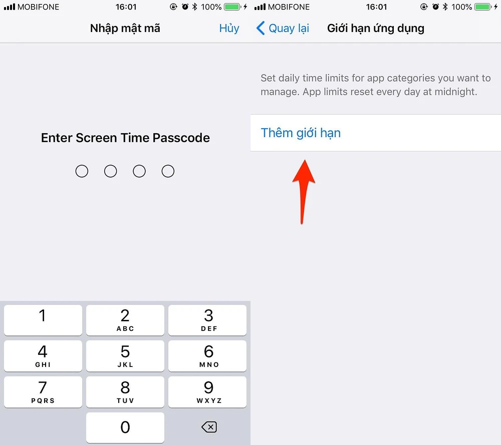 - Giới hạn thời gian sử dụng ứng dụng: Để sử dụng, bạn hãy vào Settings (cài đặt) > Screen Time (thời gian sử dụng ứng dụng) > App Limits (giới hạn ứng dụng), nhập mật khẩu giới hạn khi được yêu cầu (không phải mật khẩu máy). Trong màn hình tiếp theo, bạn nhấp vào tùy chọn Add Limit (thêm giới hạn), chọn danh mục ứng dụng tương ứng rồi nhấn Add (thêm), sau đó thiết lập ngày giờ và thời gian được phép sử dụng.