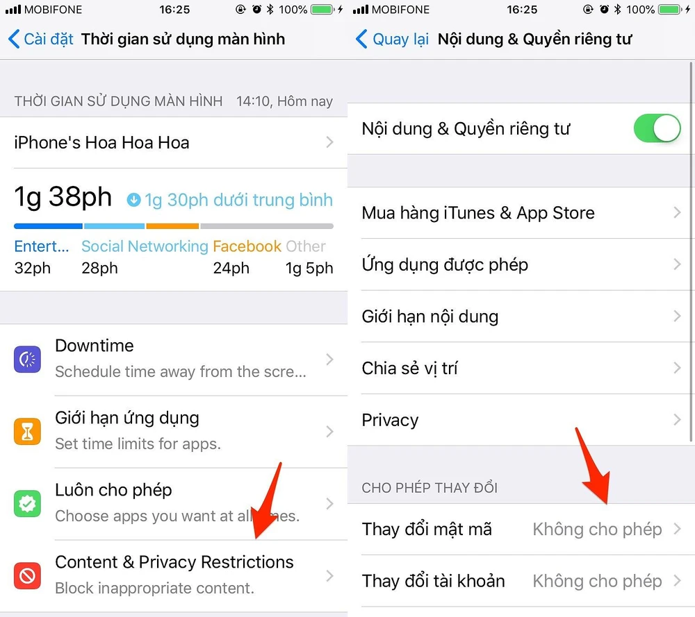 - Giới hạn nội dung và quyền riêng tư: Đây vốn là tính năng Restrictions (giới hạn) nằm trong phần Settings (cài đặt) > General (cài đặt chung). Tuy nhiên, kể từ iOS 12 trở đi, Apple đã đổi tên thành Content & Privacy Restrictions và tích hợp vào mục Screen Time (thời gian sử dụng màn hình).
