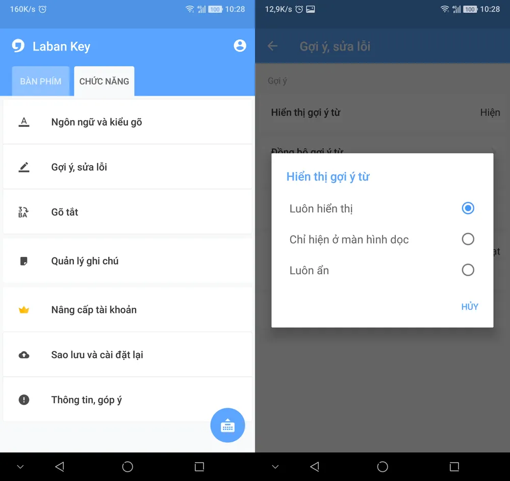 Sau đó người dùng chỉ cần mở Laban Key, chuyển sang mục Chức năng > Gợi ý, sửa lỗi > Hiển thị gợi ý từ > Luôn hiển thị. Đối với các thiết bị iOS, bạn hãy chọn Tùy chỉnh > Hiển thị từ gợi ý.