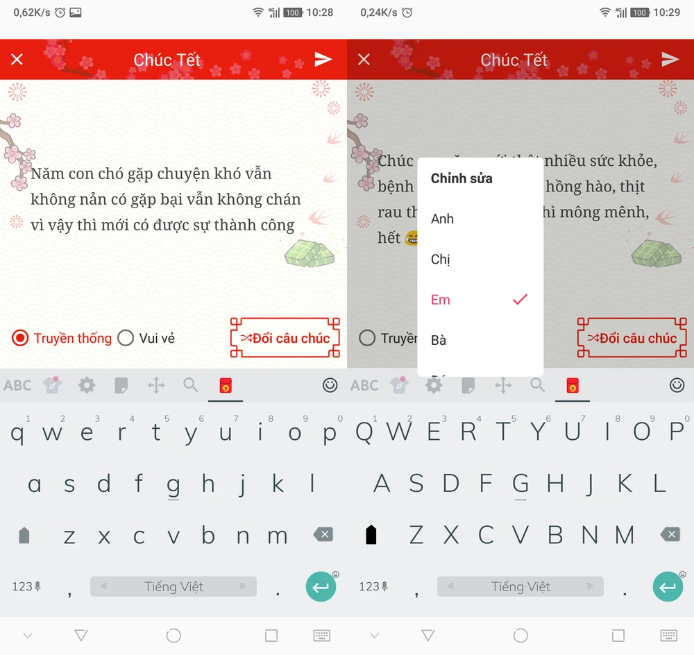 Lựa chọn loại câu chúc (truyền thống/vui vẻ) và danh xưng tùy ý. Ảnh: MINH HOÀNG