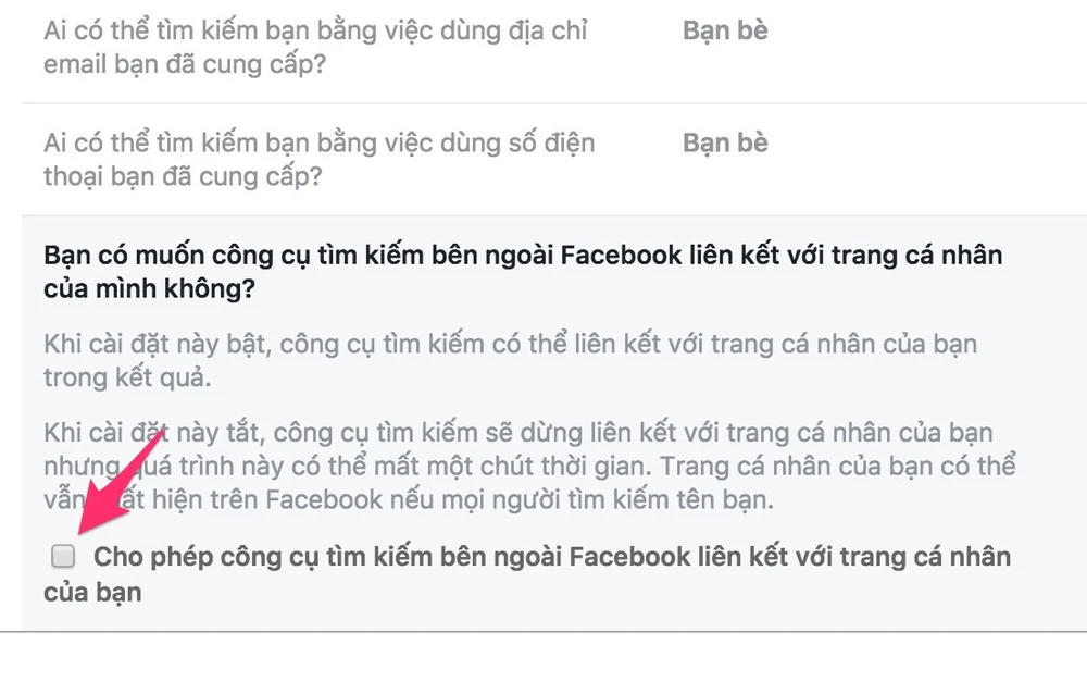 - Bước 3: Bên cạnh đó, người dùng cũng nên vô hiệu hóa tính năng liên kết tài khoản Facebook với các công cụ tìm kiếm bên ngoài bằng cách bỏ dấu chọn tại mục Allow search engines outside of Facebook to link to your profile (cho phép công cụ tìm kiếm bên ngoài Facebook liên kết với trang cá nhân của bạn).